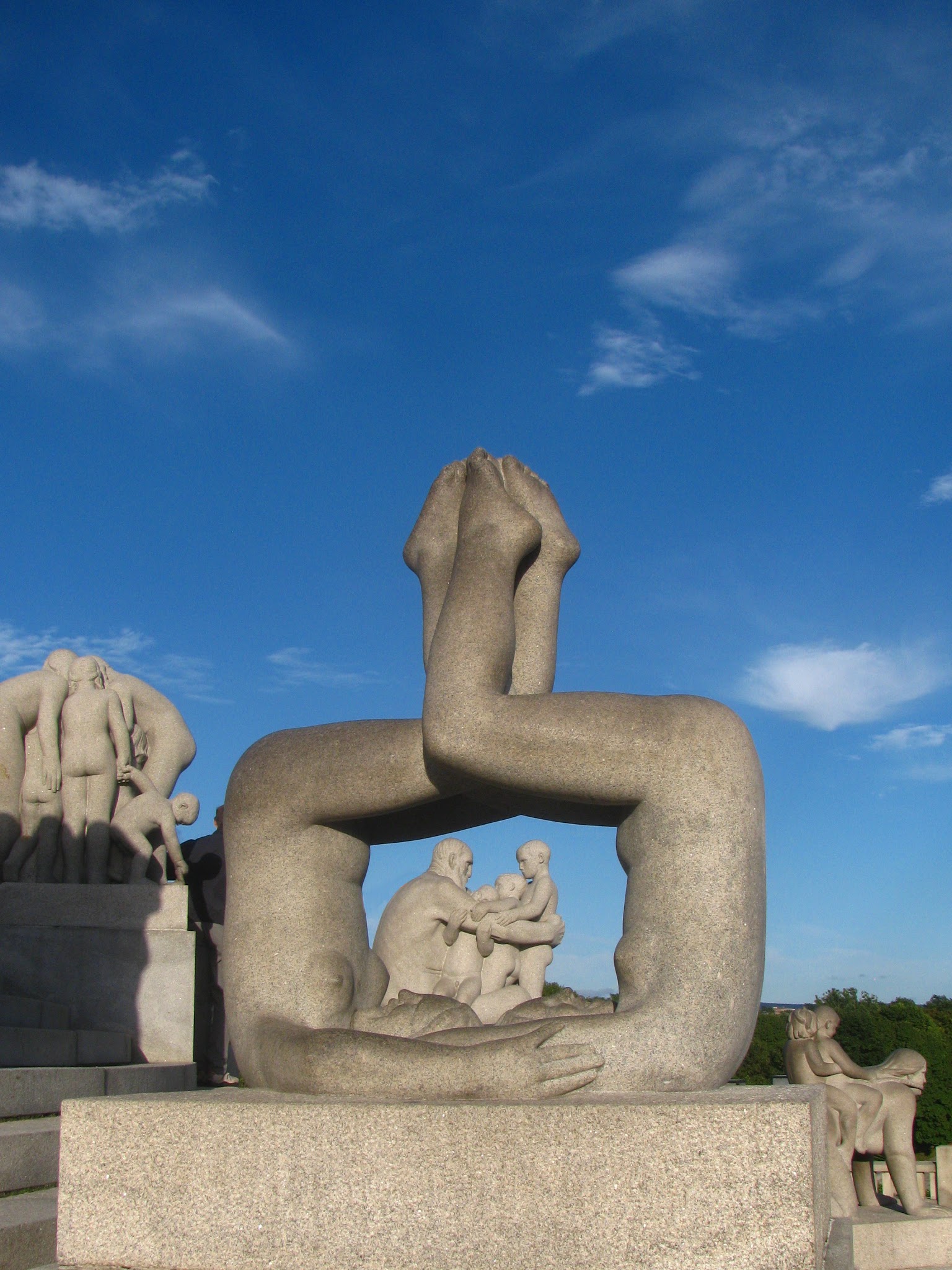 Jako poslední zastávku plánuji zastavit se ve Vigelandově parku skulptur, jedné z nejznámějších památek v Oslu. Památník je fakt velký a muselo zabrat tunu času tohle všechno vytesat. Na to, že je půl osmé večer, tak se tam stále promenáduje spousta turistů. Mně vlak jede až za dvě hodiny, usedám tedy na lavičku a píšu dopis Zuzce. „Hele, von píše česky,“ ozývá se nade mnou. Zvedám zrak a vidím vysmátou skupinku, kterak se na mě kření. Je to fajn, slyšet v té směsici jazyků zase mateřštinu. Chvíli kecáme a dostávám napít slivovice 🙂 Tu si taky budu muset na půl roku odepřít 🙁