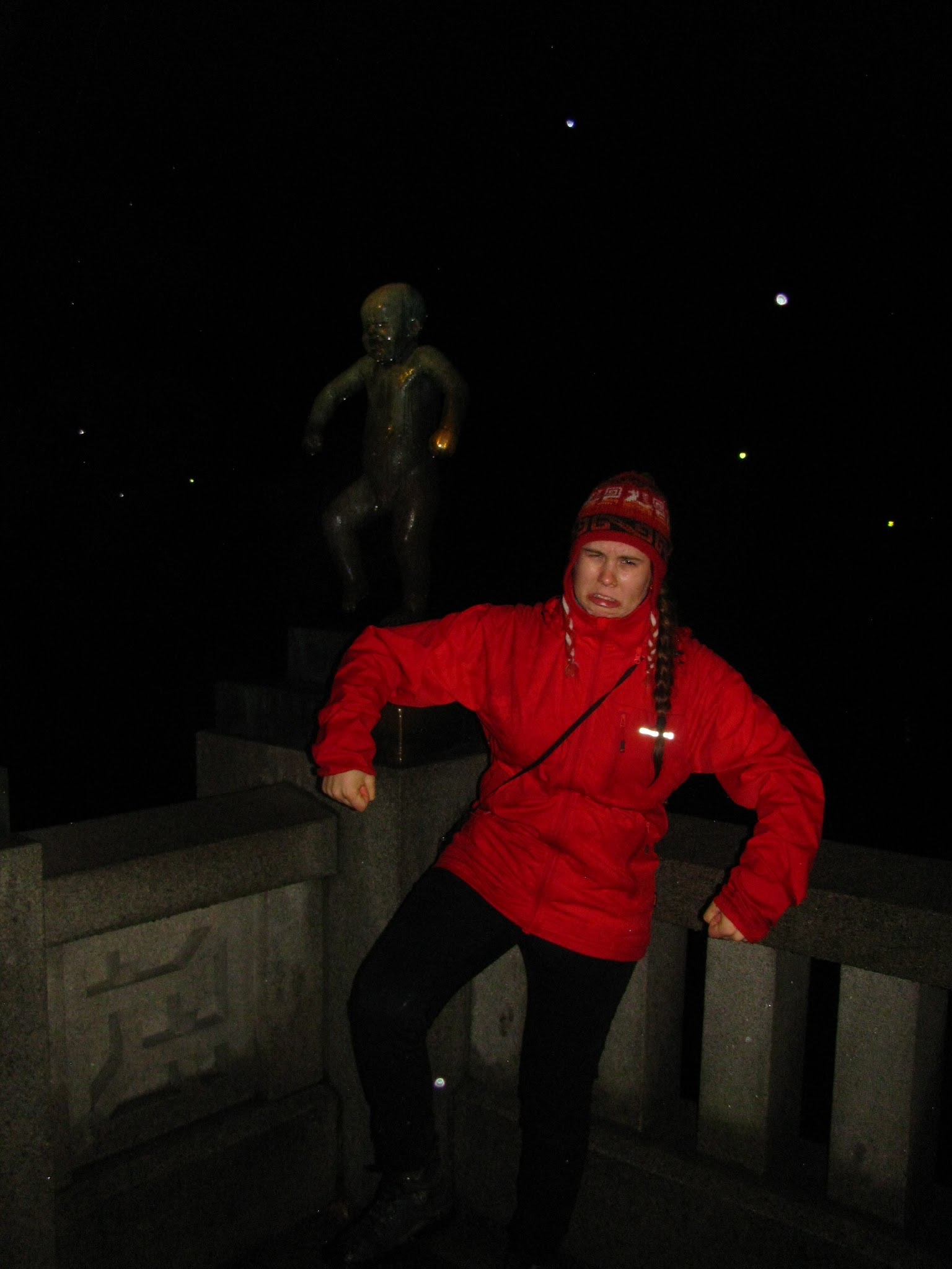 Před námi se vynořují temné sochy. Pan Vigeland musel být opravdu trpělivý, soch jsou tu mraky, výstava pod širým nebem ukrývá 192 sousoší, ve kterých figuruje více než 600 lidských bytostí. Jsou v nadživotní velikosti a k tomu všemu všemožně propletené do sebe. Hlavní dominantou je Monolit, čtrnáctimetrový sloup, ve kterém je propletených asi 120 postav. To už je panečku rvačka! Obcházíme si všechny sochy kolem sloupu a nešetříme je ironickými komentáři. Každé sousoší tak dostalo svůj jedinečný příběh. Třešničkou na dortu je pak socha Nasraného chlapečka na nedalekém mostě na konci parku. Nevím, čím si ho lidé tak naštvali, ale je to opravdu, opravdu hodně zlé. Nechtěla bych ho sama v noci někde potkat:-)