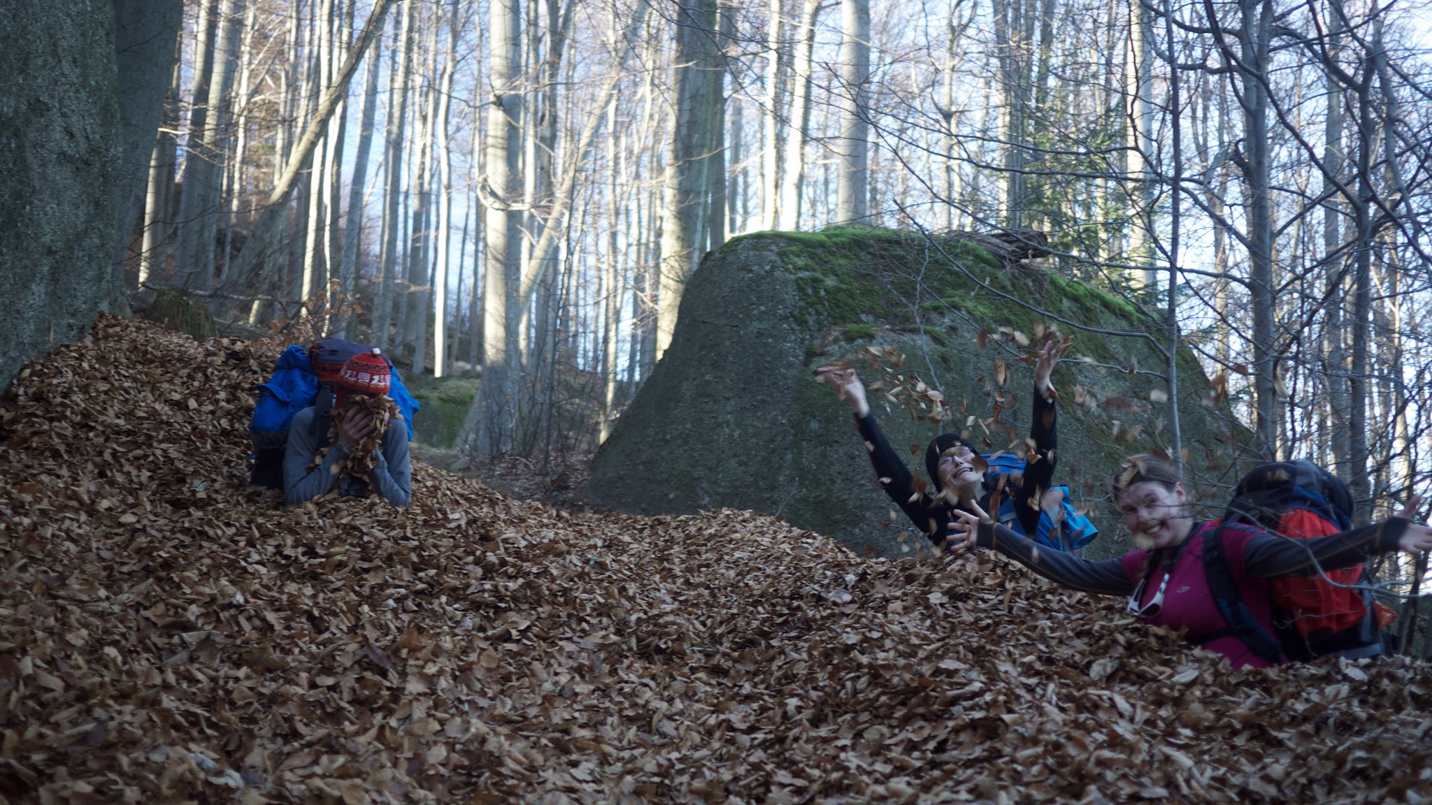 Po pomalejším startu míříme nahoru. Konečně! Už jsme potřebovali vypadnout od všeho toho učení a psaní bakalářek či diplomek. Ale kde je sníh? Podle kalendáře by mělo mrznout a sněžit, zatím se tu jen zelená tráva a zmatení ptáci se pokouší o jarní árie. Alespoň je krásně! Cestou na první vrchol Kristy s Tomem naučili Výzvu, to je taková moc pěkná hra. Kdo ji nezná, rádi vysvětlíme, proč si každou chvíli v půli věty říkáme „bez výzvy“ nebo si leháme na zem (i na místech veřejných jako je např. lékarna 🙂 ) Brodíme se v závějích rezavého listí a když už se nemůžeme koulovat sněhem, alespoň blbneme v listí.