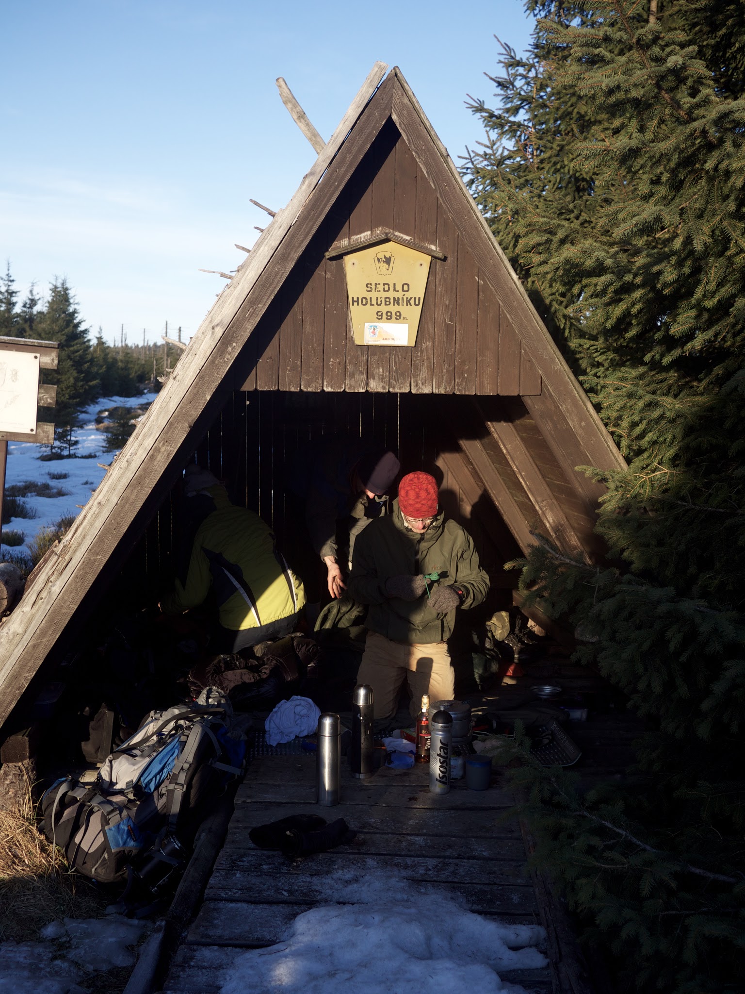 Začíná se stmívat, k přístřešku v sedle pod Holubníkem přicházíme tak akorát. „Z těch fotek to vypadalo větší,“ myslíme si. Nicméně, budeme se muset vejít. Chystáme spaní, vstup zavětrováváme pláštěnkou. Stačí už jen uvařit a zalézt si hezky do tepla spacáku. Čočka s polentou, zeleninou a koňskou dávkou chilli to jistí, okamžité dračí zahřátí zaručeno. Zabubaní ve spacáku sladce usínáme… „Nazdar blbouni,“ ozve se temnou nocí, ale nenásleduje žádná akce. Mohl by to být jen sen, kdyby…