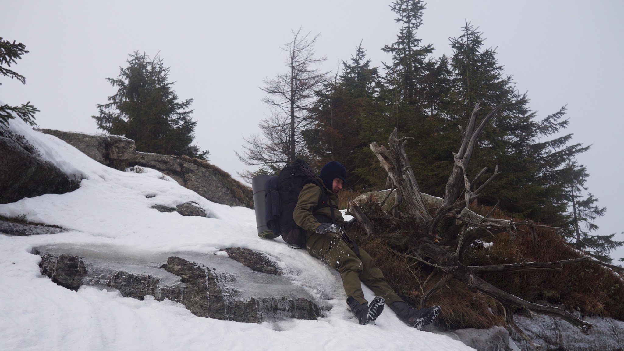 Po smědavské pauze pro zateplení těla, duše i žaludku zbývá už jen kousek do cíle. Jak to tak v horách bývá, Smrk si pro nás připravil mlhu, rychlé stmívání, vítr a bahno. A nebeský žebřík vedoucí do půli kopce byl spíše dílem ďáblovým. Útulna pod rozhlednou na Smrku je parádní a máme ji celou pro sebe. Vaříme a dýcháme o sto šest (bez výzvy), aby teplota stoupla alespoň na čtyři stupně nad nulou. „Už je tu bez výzvy tři a půl!“ Večerní zábava je v plném proudu, povídání ve spacáku, vtípky a historky. Žádní vožralové, žádné hlučné partičky. Tedy prozatím. Po jedenácté totiž přišel do útulny jeden Polák a bez výzvy o půl dvanácté se dostavila partička přiopilých hlučících silvestroslavičů. A je po klidu.
